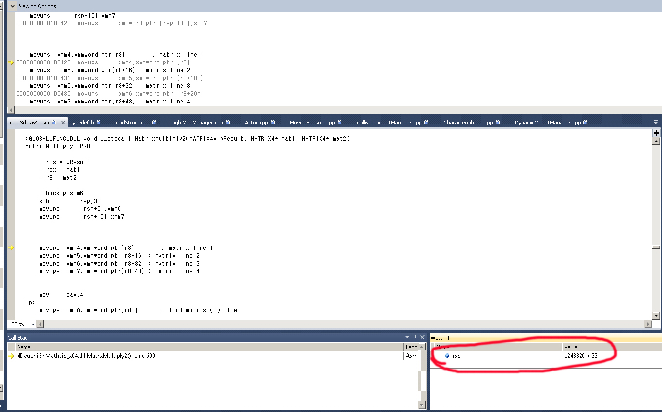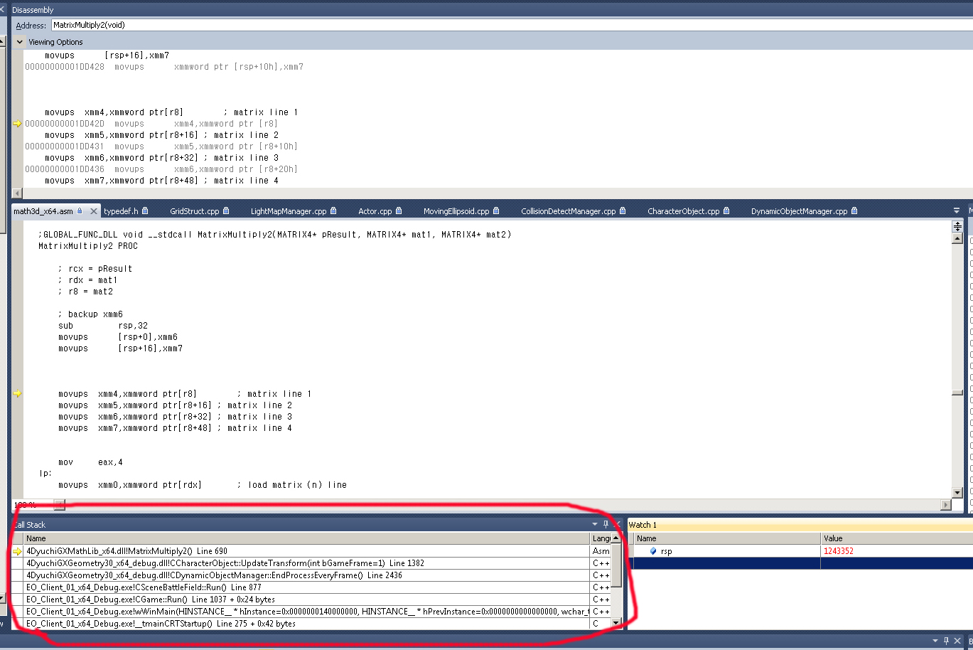 어쨌거나 엔진에서 사용하는 상당수의 수학함수들은 x64어셈블리로 작성되어있으므로 이 안에서 크래시하게 되면 콜스택이 제대로 표시되지 않는다.