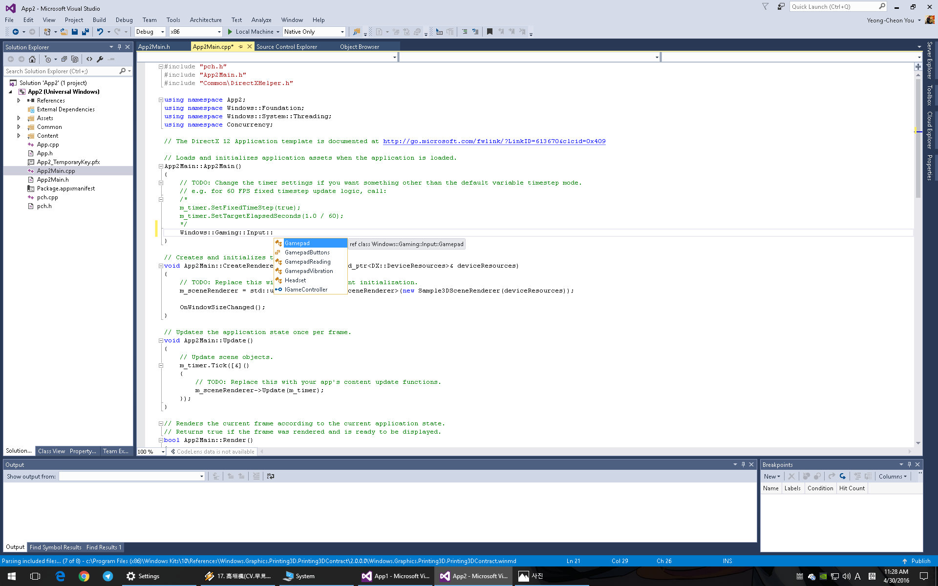 UWP에서 게이밍 인풋 처리는 Windows::Gaming::Input네임스페이스에 들어있다.