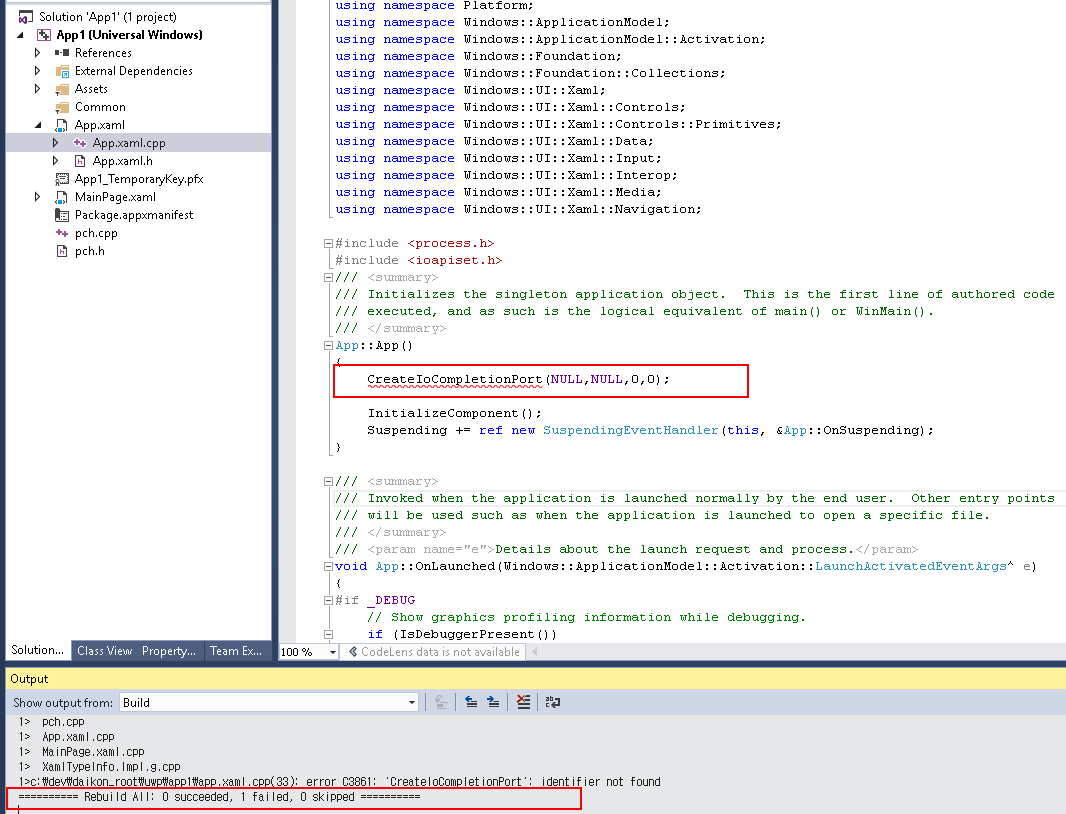 간단한 UWP프로젝트를 하나 만든다. 타겟 빌드는 10.0.10586.0 현재 Windows 10의 정식 빌드이다.그리고 CreateIoCompletionPort()를 호출해본다.