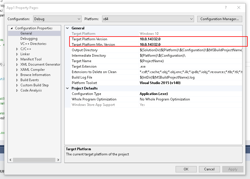 빌드 타겟을 바꾼다. Redstone빌드로. 물론 사전에 Redstone SDK는 설치되어있어야한다. 현재 내 머신에는 Windows 10 Preview SDK 14332가 설치되어있다.