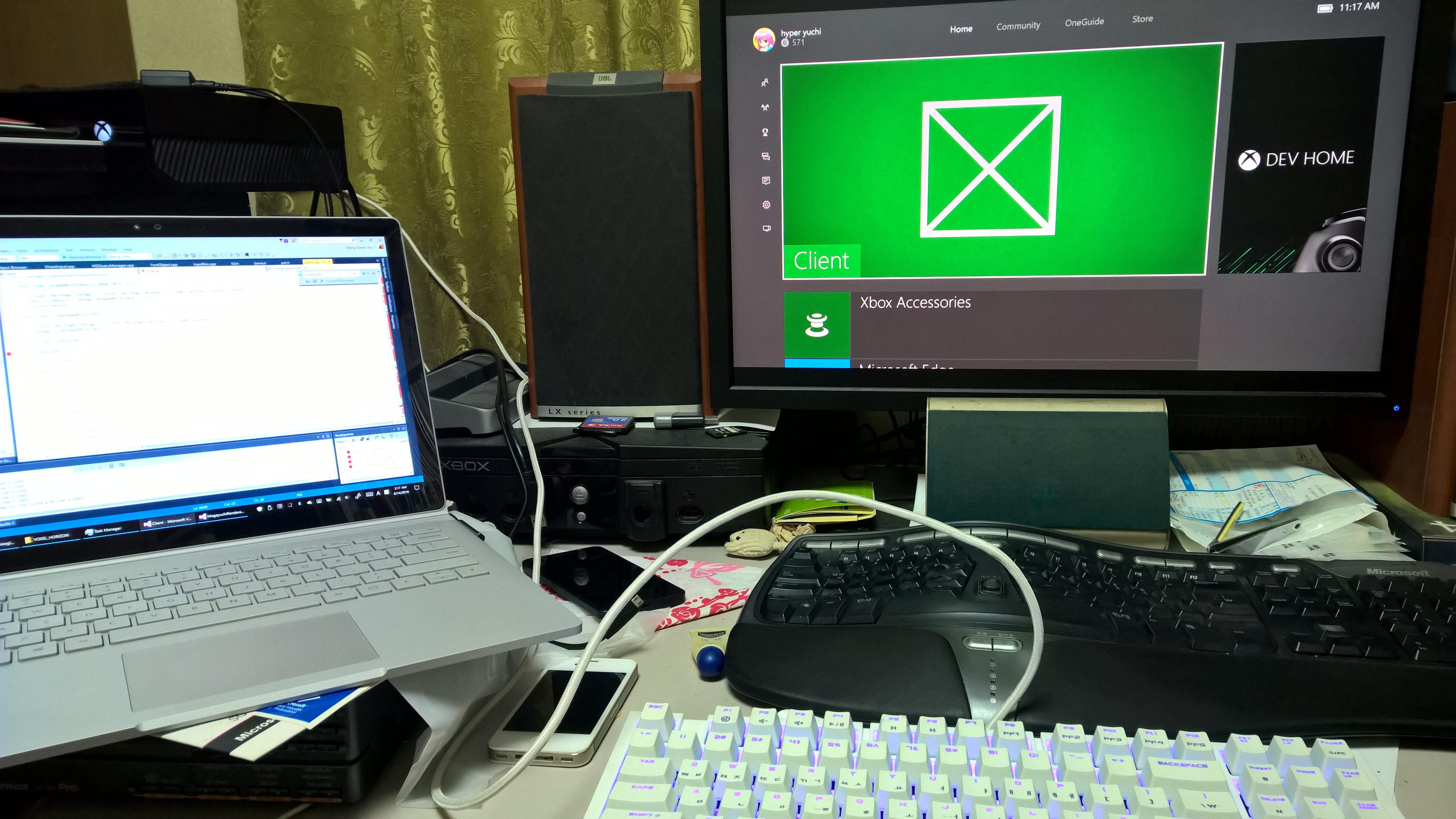 XBOX ONE의 HDMI출력은 데스크탑 모니터에 연결했고, 서피스북으로 배포/디버깅을 하고 있다.