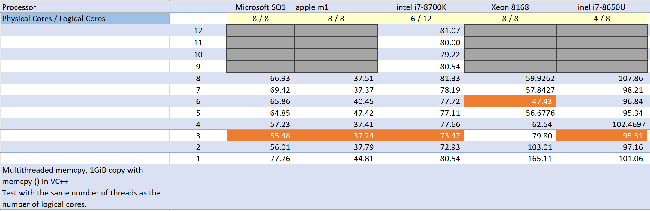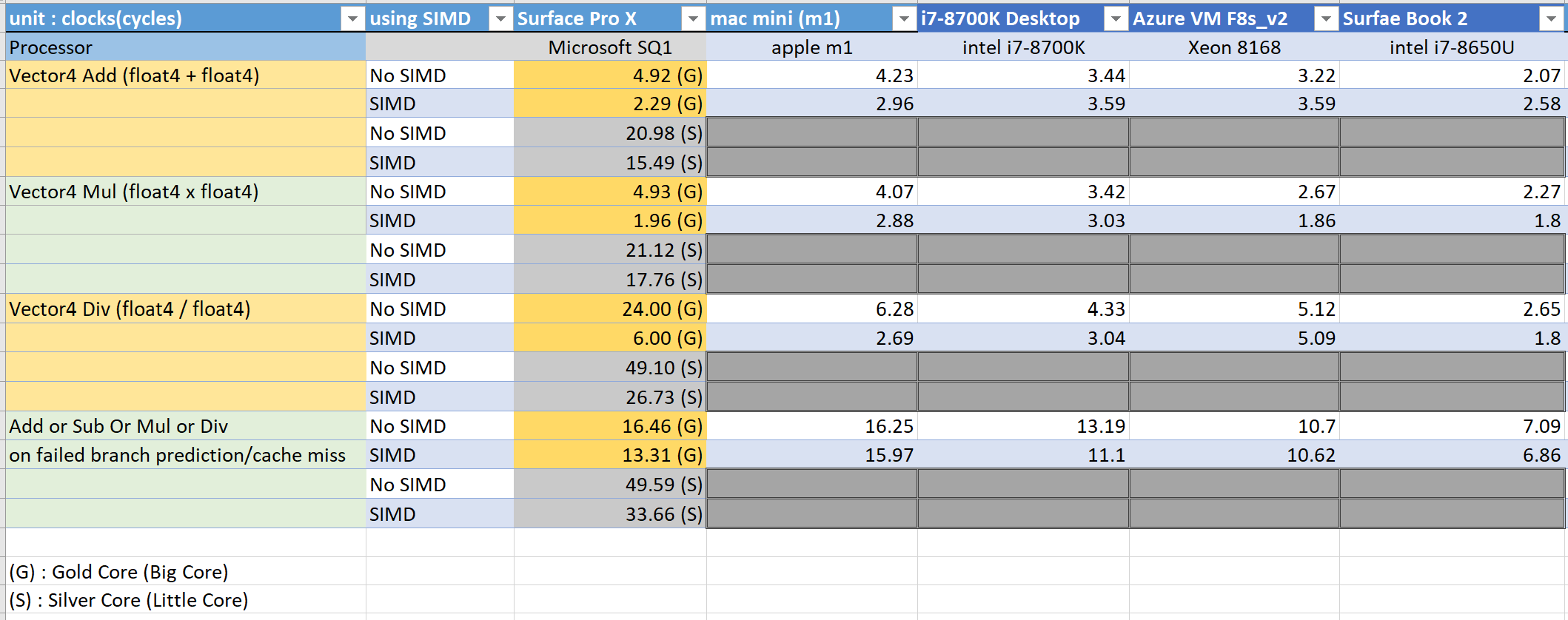 x86의 성능이 균일하게 뛰어나고 m1도 좋은 축에 속한다. SQ1은 2배 정도 느리다. 2019년 리뷰에서 이 문제를 지적한 바 있다.