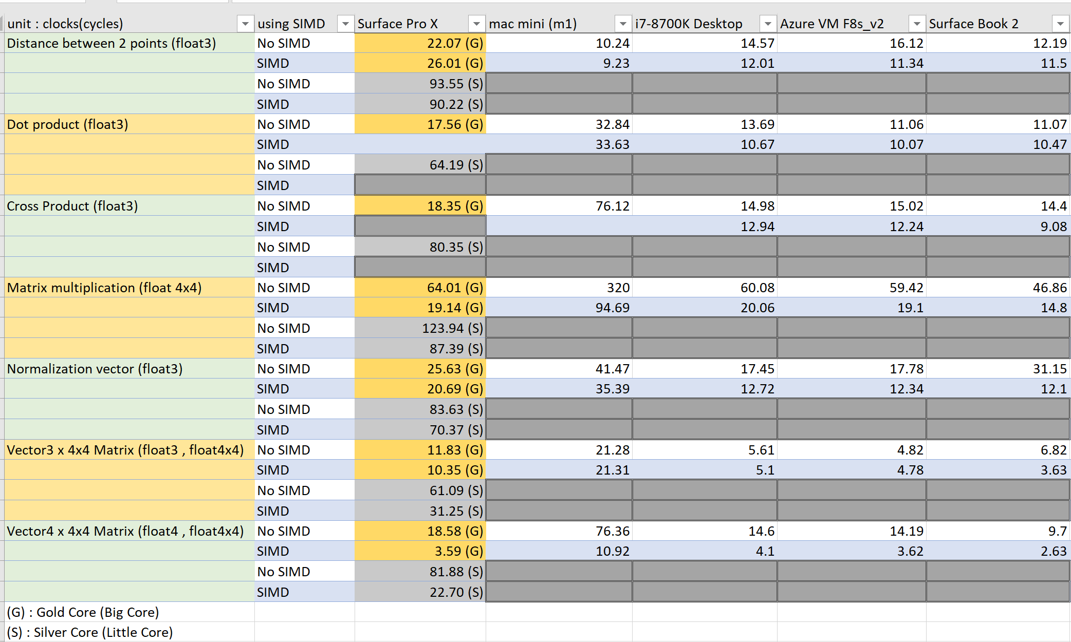 성능에 민감한 수학함수들의 경우 x86/x64에선 SSE/AVX를 사용하고 있다. ARM64아키텍처인 Surface Pro X/m1 Mac에서는 Neon(ARM64용 SIMD명령셋)으로 작성된 코드를 사용한다.