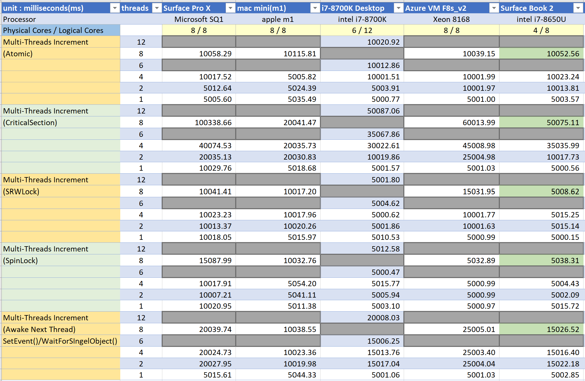 스핀을 도는 도중에 작업을 끝내면 스레드가 wait될 일이 없다. 따라서 클럭이 높은 시스템이 테스트에서 좋은 결과를 얻을 가능성이 높다. 실제로 클럭이 높은 편에 속하는 i7 8700K와 i7 8650U프로세서의 응답성이 좋게 측정된다.