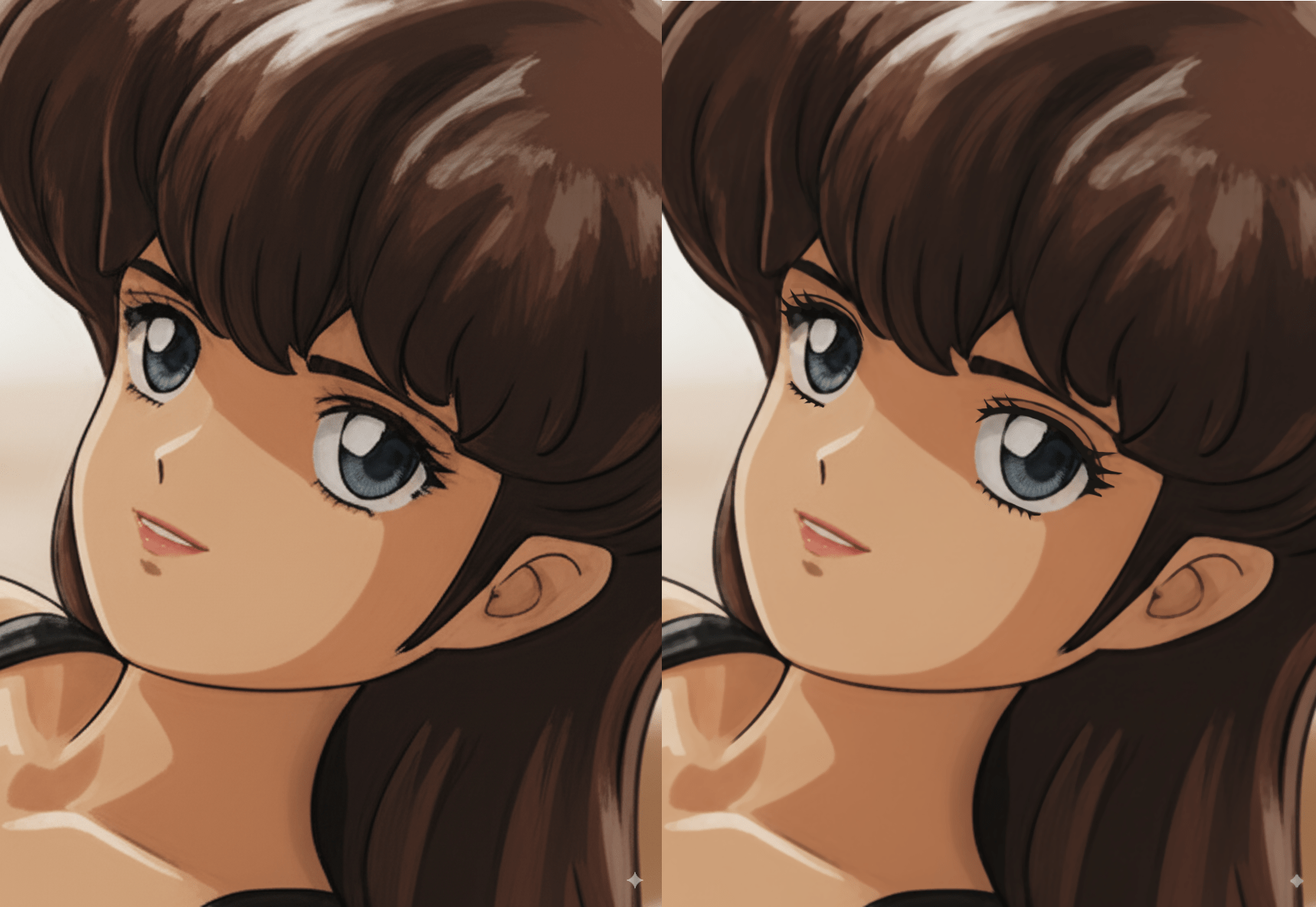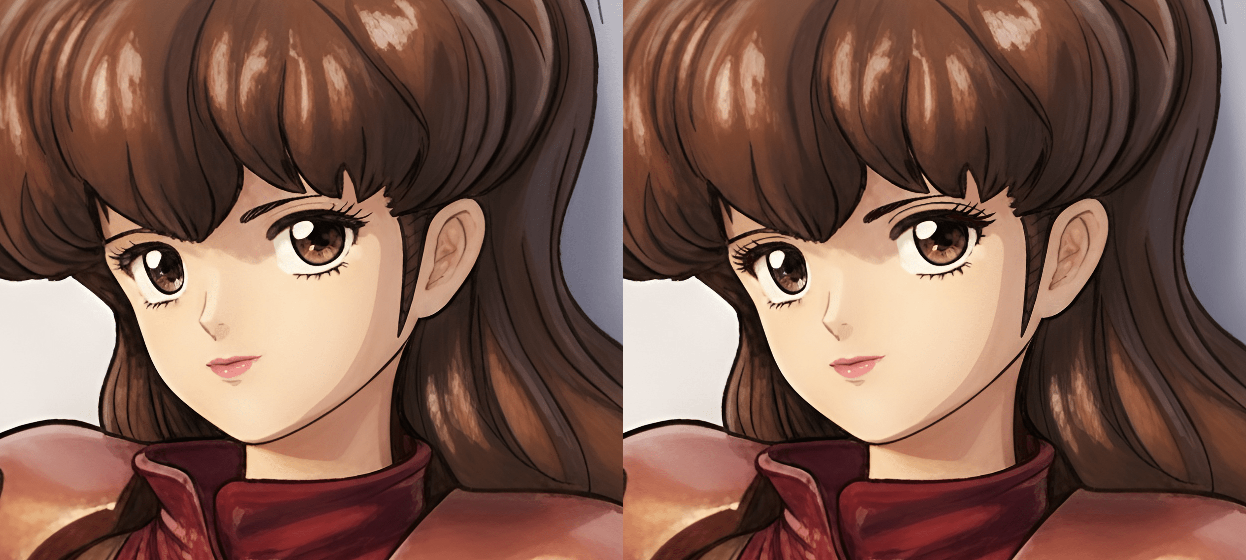 그럼에도 불구하고 눈썹 디테일에 문제가 있다. 원래 사진은 꽤 해상도가 높았고 속눈썹도 잘 표현되었지만 생성 과정에서 속눈썹 디테일이 뭉개졌다.